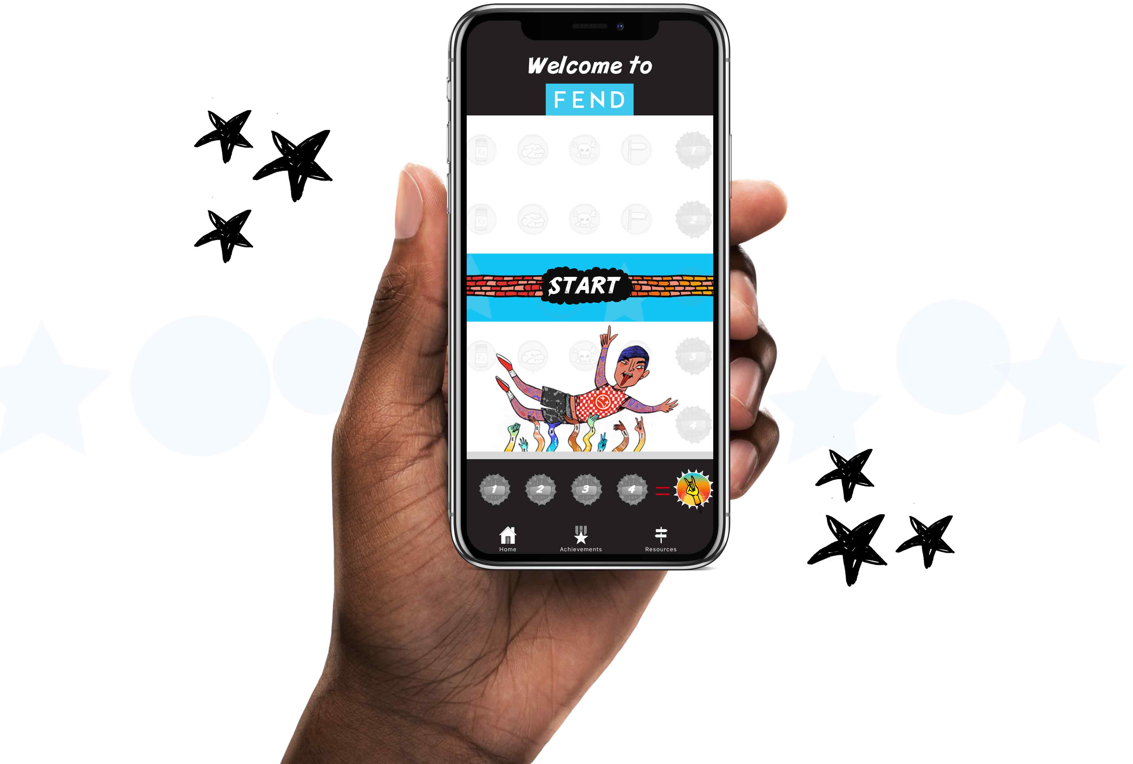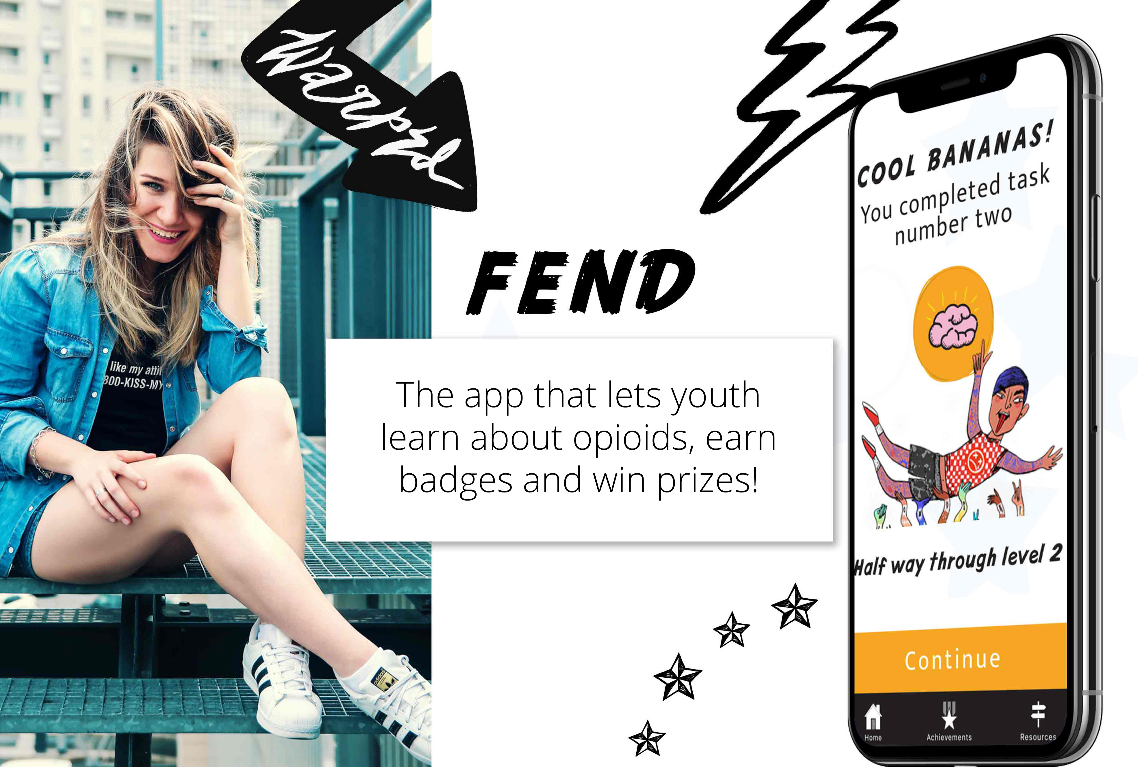 FEND uses gamification to teach youth about the dangers of opioids. The user interacts with the app and learn about opioids through answering questions, watching videos and infographics. The contect is backed by motivational personalities, musicians and by research conducted by USC.