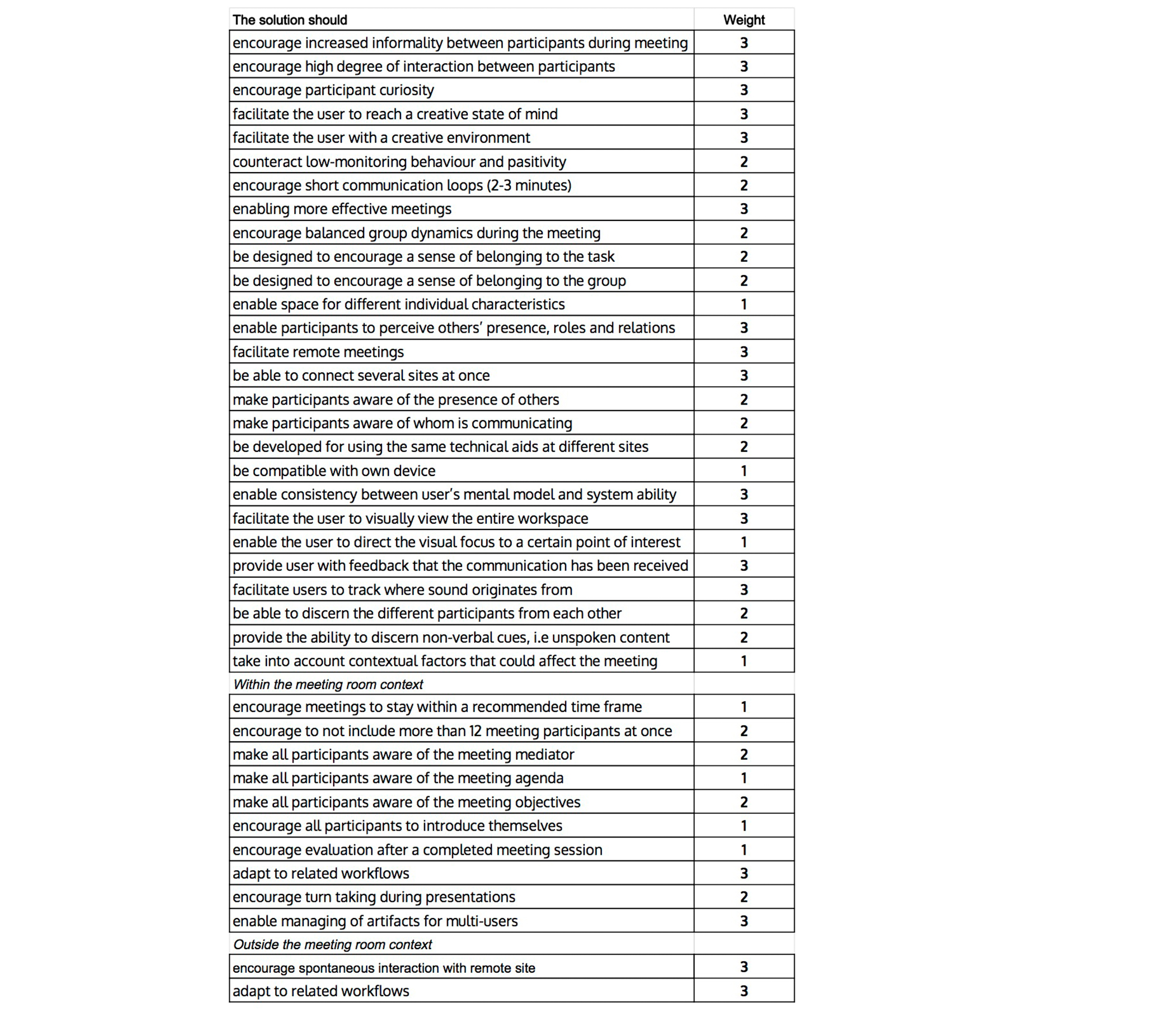 As larger corporations like Ericsson and Semcon increase their mobility, so too increases the demand for tools that assist creative and efficient collaboration. Our scope was to investigate what the crucial parameters were from a user perspective when holding a meeting remotely. Methods used included contextual inqury, interviews, observations, and workshops.